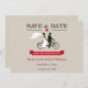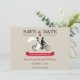 Trendy Save the Date cards with a bride and groom on a tandem bicycle. Fun vintage design with a red banner on a taupe background. Also available in other colours. Get the matching save the date stamps below: