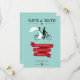 Trendy Save the Date cards with a bride and groom on a tandem bicycle. Fun vintage design with a red banner on an aqua background. Also available in other colours. Get the matching save the date stamps below: