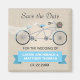 Bicycle weddings are a fun, new trend in themed weddings. On this faux linen background save the date magnet, a tandem bicycle symbolises the married couple-to-be. The bride's seat has a wedding veil on it. The groom's has an untied bow tie wrapped around the handlebars with the bridal bouquet in the bike's basket. The couple's names stand out in a sky blue banner below. Perfect for a bicycle themed or any outdoor wedding. Available in alternate colours with a tandem bike option.
