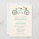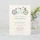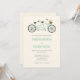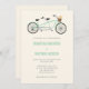 A modern wedding invitation featuring a tandem bike with a basket and flowers. Please ask about custom colours!