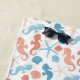Tangerine coral and cerulean blue are the colours in this pretty nautical theme beach towel. Images of seahorses, seashells, and starfish make up the repeating pattern. At the centre is a matching blue lined ornate banner with your monogram and name in tangerine and blue. Everything is placed on a white background. Cute!