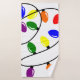This towel set has a red washcloth, a green hand towel, and a bath towel with a Christmas design of tangled lights in red, blue, yellow, green, pink, and purple.