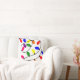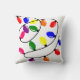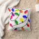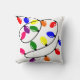 This throw pillow has a Christmas design of tangled lights in red, blue, yellow, green, pink, and purple.