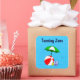 Fun beach or swimming pool themed art of a red beach ball, green sun umbrella, vacation sandals and suntan oil on a watery blue background with curly waves. The text reads Tanning Zone.