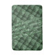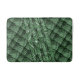 A estampa do tapete é uma imagem verde cheia de manchas ou riscos num efeito quadriculado e tons mais escuros em alguns lados dos quadrados, dando a impressão de relevo ou profundidade.