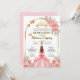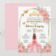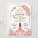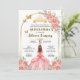 Esta tarjeta para fiesta de quinceanera tiene rosas rosas con color dorado y la imagen de una quinceanera con un bestido de princesa color rosa con dorado. Se puede personalizar con su nombre, el nombre de los padres, padrinos, la fecha y direccion de la fiesta.