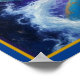 Poster in "The World" tarot card portraying a graceful woman in ornate blue robes, symbolising unity and fulfilment. Standing atop a radiant globe, she embodies harmony, wholeness, and universal connection.