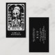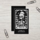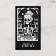A unique tarot card themed nail technician business card featuring a skeleton with tools of the nail technician. A unique style with a touch of humor. White on black card.