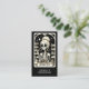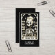 A unique nail technician business card featuring a skeleton with tools of the nail technician. A unique style with a touch of humor. Sepia and white on black.