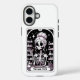A unique nail technician promotional phone case, (Select your device model) featuring a skeleton with tools of the nail technician. A unique style with a touch of humour. Pink & black.