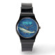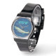 Fishing themed, tarpon watch for the saltwater fisherman. Tarpon image with blue water design and three monogram initials in bright blue. Perfect gift for any deep sea, sport fisherman. This black strap is one of many band and face options for a men's watch. Choose the one you prefer.