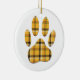 A cute tartan, plaid, dog paw print in orange, black, white, green and red colours.