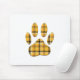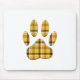 A cute tartan, plaid, dog paw print in orange, black, white, green and red colours.