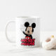 This design features a cheerful and iconic cartoon character giving a playful wink while flashing a peace sign. The bold red "MICKEY MOUSE" text beneath the character adds a fun, energetic touch that stands out beautifully against the black background.