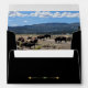 Tatanka Bison Yellowstone EMP Western Ranch Invitation Envelope. The front of this beautiful black envelope has a customisable return address and is embellished with a golden and turquoise arrow. The back flap of the envelope features a turquoise beaded bison head with the golden arrow design on black envelope. The inside liner features a beautiful photo of white and natural coloured Bison grazing in a mountain valley. Pair this special envelope with the coordinated Tatanka Bison Yellowstone Wedding Invitation or formal Cowboy Yellowstone ranch style boots and suits cocktail party invitation. See the other beautiful coordinated suite, save the date cards and matching envelope, wedding and party products from our Tatanka Bison Yellowstone Collection.