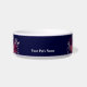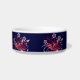 This design is a tattoo of many different flowers, leaves, and vines. A few butterflies can be seen flying around the flowers. The colours of the tattoo are a red colour with a hint of peach. The pet bowl has 4 flowers, 2 on each side. Your pets name can be put on the front of this dish. A dark blue backround was used.