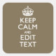 Your personalised Keep Calm saying on a fine custom taupe beige colour style decor. A personalised Keep Calm style saying on a one of a kind gift. Humourous or whimsical try on your creative words on two editable lines of text. Remember to use CAPITAL letters for best results.