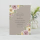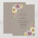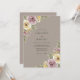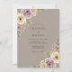 This design features a warm taupe backdrop adorned with soft watercolor florals. Romantic mauve roses and buttercream yellow blossoms create a vintage-inspired aesthetic. Delicate sage green foliage and small purple accent flowers cluster at the corners for an elegant, earthy feel. The palette is perfect for a sophisticated romantic event.