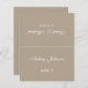 A simple taupe wedding place card with the guest name and the table number printed on its front and the bride and groom names and the wedding date printed on the other side (that is the other half, before folding it). All text is white.