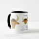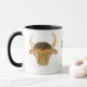 A white ringer mug with black lip and handle and a bull, front and back, from a watercolour painting by Judy Adamson. Between the two bulls is a smaller image of a bull, the dates and the four most positive traits of a Taurean. Matching greeting cards, gifts and t-shirts are also available.