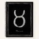 Stylised hammered silver Taurus the Bull astrology zodiac birthday symbol in a hand drawn silver fine double line frame. A hardcover or softcover notebook with your choice of inside pages. Choose from sketchbook, bullet journal, checklist, graph paper, recipe book, or lines in various widths and colours. Customisable. Aquarius text in a fine script on the front cover can be personalised, text can also be added on the back.