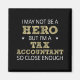 I may not be a hero, but I'm a Tax Accountant so close enough humourous word art in sans-serif and doodle cross-hatch font lettering in white and golden yellow with two distressed accent stars.