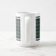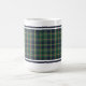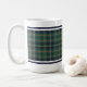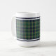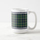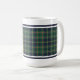 Coffee mug with the tartan for Clan Taylor and its septs, including MacTaldridge. Light green and navy blue Scottish plaid pattern from 1955, with light orange, yellow, and black accents.
