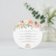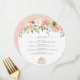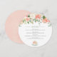 Cascading flowers at the top of this sweet baby shower menu are in beautiful soft colours of peach, pink, white and celadon. A tea cup at the bottom has a bouquet of flowers cascading from the rim. Perfect to tell your guests at a tea themed baby shower what will be on the menu.