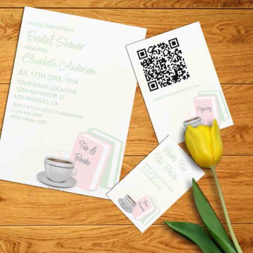 Tea and books bridal shower. Featuring pink and green books, and a cup of tea