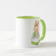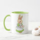 A cute illustration of a rabbit wearing a calico dress and pinafore, holding a teapot. Art by Carmen Medlin.