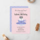 This custom birthday party invitation is perfect for a tea cup puppy birthday party. This light pink birthday party invitation features a blue-eyed Siberian Husky puppy sitting inside of a purple tea cup. The purple tea cup set has a white polka dot pattern. Customise this invitation with your own party details (i.e., name, age, location, rsvp.)