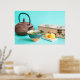 Tea set for one person with cast iron teapot, handmade clay teacup, tea box and two cheese scones.