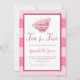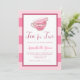 A dainty Tea Themed birthday invitation for your little girl's second birthday. Design includes two stacked teacups in shades of pink. Background has alternating stripes in a pastel and bold pink. The back of the invitation has a gold glitter look.