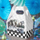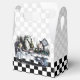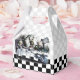 Gable-style favour box with a vintage Alice in Wonderland image, on the front and back, of the Mad Hatter’s tea party with Alice, the March Hare and Dormouse on a grey and white and black and white chequerboard background. See the entire Wonderland Favour Box collection in the PARTY FAVORS section.