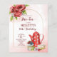 Tea party birthday budget invitation template. Red flowers, red polka dot tea pot, tea cup, and a cupcake, watercolor. Lovely for any age.