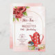 Tea party birthday invitation template. Red flowers, red polka dot tea pot, tea cup, and a cupcake, watercolor. Lovely for any age.