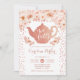 Tea Party Birthday Party Invitation. Elegant design in faux glitter rose gold with floral accent. Invite card with glitter tea pot and script font with confetti. Blush coral pink, white. Perfect for a stylish bday celebration. Can be customised into any age.