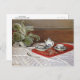 A fine art postcard with the impressionist painting, The Tea Set (1872), by Claude Monet (1840-1926). A still life with a porcelain tea set in a blue and white pattern on a white linen tablecloth next to a potted plant.