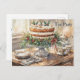 This postcard features a watercolor illustration of a beautiful layer cake, decorated with festive Christmas elements. A stylish teapot and matching teacups complete the scene. The design includes the words "tea party" at the top and a sweet invitation message on the back. It's a customizable template, making it easy to personalize.