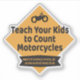 Teach Your Kids to Count Motorcycles sticker to help promote motorcycle awareness and safety. Design in black on a caution orange diamond with s small motorcycle graphic.