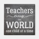 "Teachers change the world one child at a time" thoughtful typography quote in blackboard background and white script. It could make a nice thank you gift to your best teacher.
