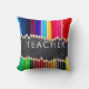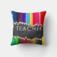 Unique, bright chalkboard teacher pillow would be a cute teacher appreciation gift for teacher's week or back to school gift or present for artist or graphic designer- Has photo border at top and bottom of rows of pencils in bold, bright rainbow colours. Reads 'Teacher' in the centre in modern lettering. Against a faux vintage chalkboard background. Identical on back. Fun gift for art teachers and artists, too. We have more teacher gifts and pillow designs in our Zazzle.com/angela65 shop.