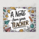 Brighten your students' day with this colourful and fun postcard! Perfect for elementary school, this 'A Note from Your Teacher' postcard is ideal for back to school greetings, or a positive note home. Teachers can use this educational and engaging design to welcome students in a memorable way. Featuring playful school supplies and an apple illustration, it’s perfect for all ages. Add a personal message on the back to make each student feel special. Great way for teachers to develop relationships or just to share student progress.