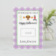 This teacher Halloween card features a purple and white plaid background with green accents and says "No tricks just a treat. Happy Halloween!" and a cute little trio of costumes. There is also a space to leave a gift card. Personalise with your child's name.