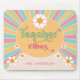 This teacher's mouse pad features a fun 1970s style retro design showcasing colourful sun rays. The retro text reads: Teacher Vibes. Personalise with the teacher's name.