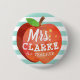 A fun and lighthearted seafoam green striped button featuring a stylised apple illustration. Inside of this apple is your favourite teacher's name in a playful style font.