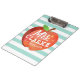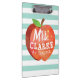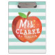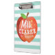 A fun and lighthearted seafoam green striped clipboard featuring a stylised apple illustration. Inside of this apple is your favourite teacher's name in a playful style font.