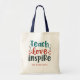 Teacher's Appreciation Personalised Tote Bag Reads "Teach Love Inspire" in a bold, fun font, accented with cute, hand drawn hearts and personalised with your favourite teacher's name.