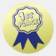 Kid's love stickers and what better way to award something special, in the class room, then giving out award stickers. This round sticker has graphics of a blue ribbon, against a gold tone background, and fun blue graphic text reading, 1st PLACE. Great for any age child.