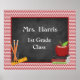 This poster design has red chevron print around the outside with a chalk board inside where you can personalise teacher's name, class or class rules. This poster has a red apple, math, reading and english books and on the other side is pencils in a holder standing over a ruler.